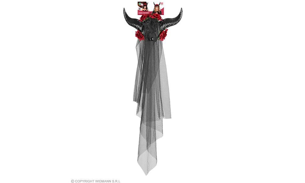 "BRIDAL VEIL WITH HORNS. ROSES. LACE AND BLACK GEM"