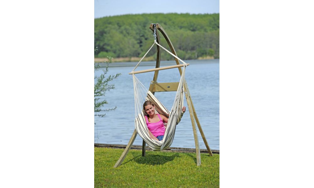 Βάση αιώρας καθίσματος από έλατο με λεπτομέρειες από ανοξείδωτο ατσάλι (γαλβανιζέ). Το ξύλο είναι ανθεκτικό σε παντώς είδους καιρικές συνθήκες. Διαστάσεις βάσης: 147 Χ 234 Χ 139. Συνολικό βάρος βάσης 20 κιλά. Βάρος αντοχής 160 κιλά. Δέχεται όλες τις αιώρες καθίσματος AMAZONAS.