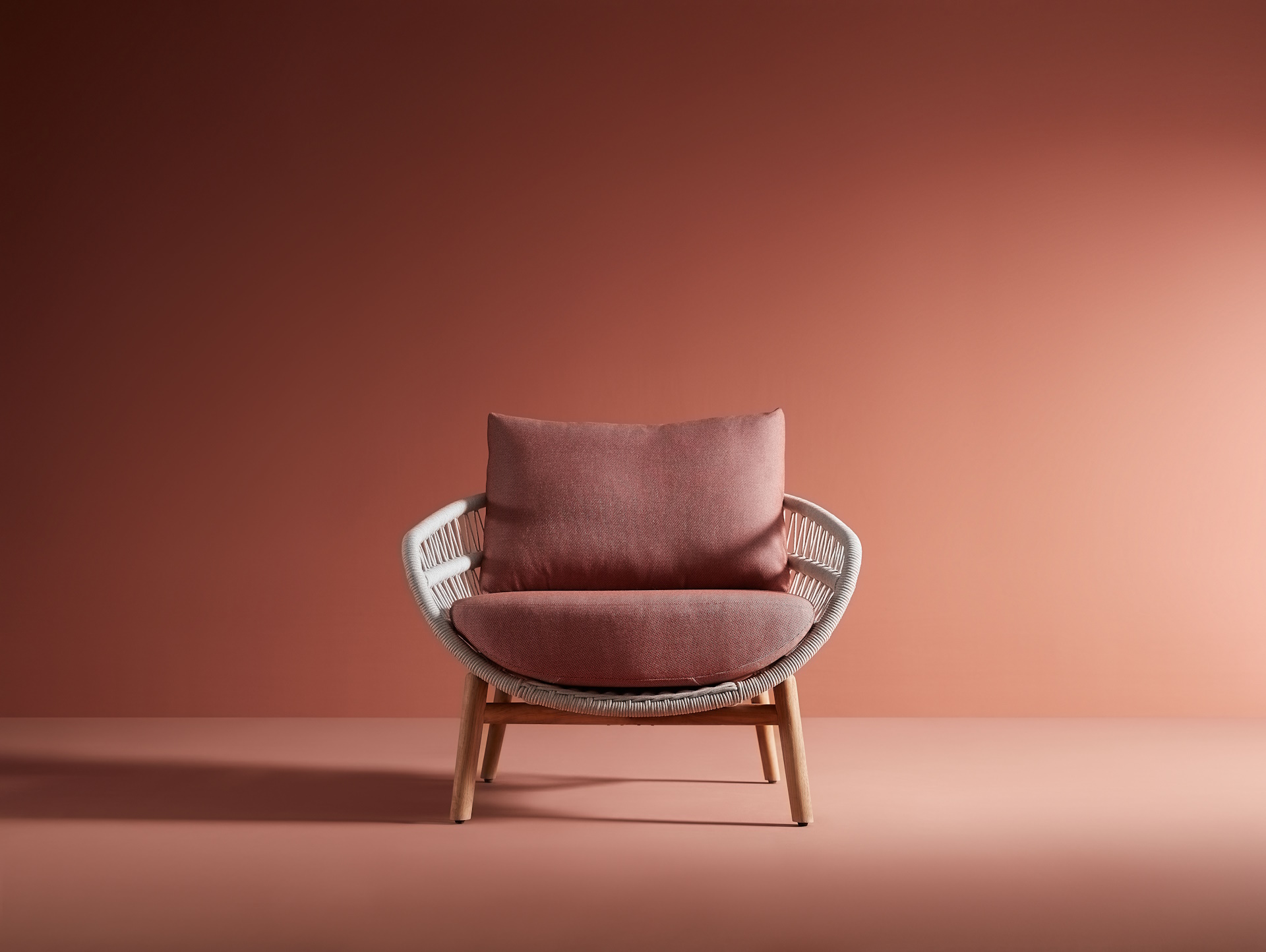 A lounge set of 4 pieces consisting of: 2 lounge armchairs in size 93,5x79,5x72cm, 1 lounge 3-seater sofa 229,5x79,5x72cm and 1 coffee table 120x70x39,5cm. The frame is made from solid teak wood and aluminum weaved with rope. Outdoors cushions in terracotta color. The decorative cushions are included.