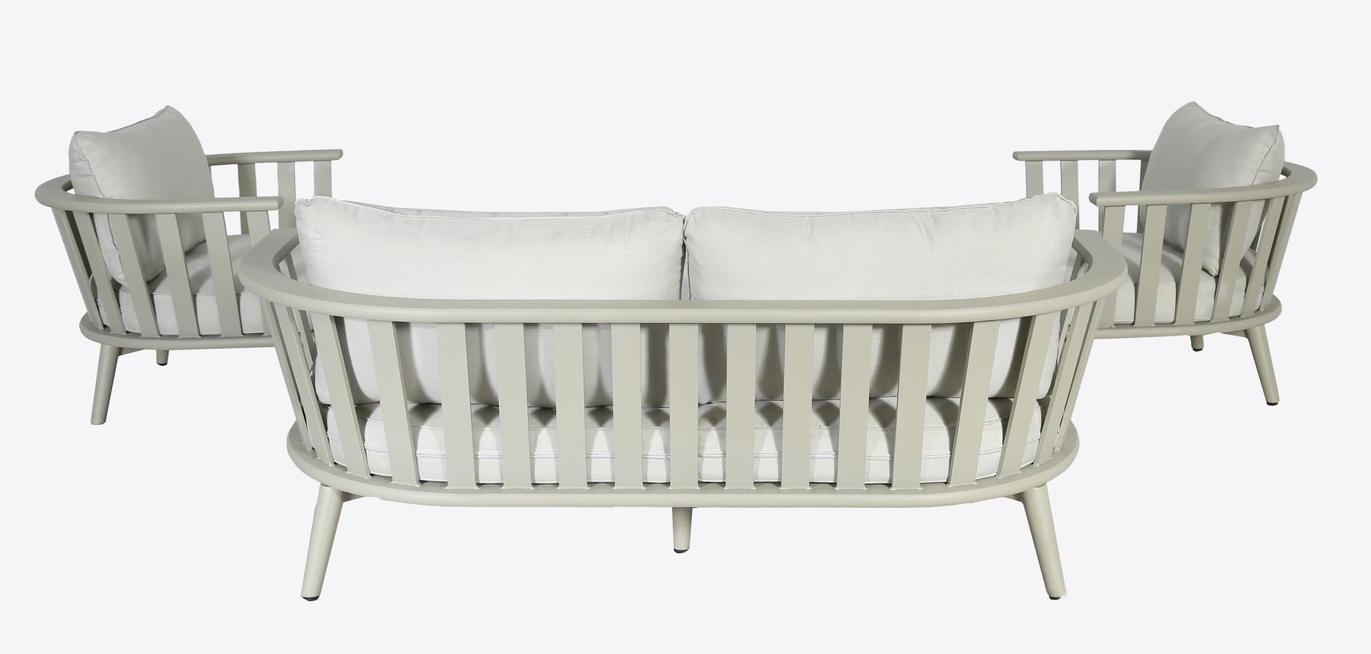 Ένα lounge set 4-τεμαχίων, αποτελούμενο από: 2 πολυθρόνες lounge διαστάσεων 95x77x61cm, 1 καναπέ lounge 2-θέσιο διαστάσεων 175x77x61cm και 1 κεντρικό τραπέζι καφέ διαστάσεων ø80x24cm. Ο σκελετός είναι κατασκευασμένος από αλουμίνιο σε ιβουάρ χρώμα. Μαξιλάρια outdoors στο χρώμα της άμμου. Τα διακοσμητικά μαξιλάρια δεν συμπεριλαμβάνονται.