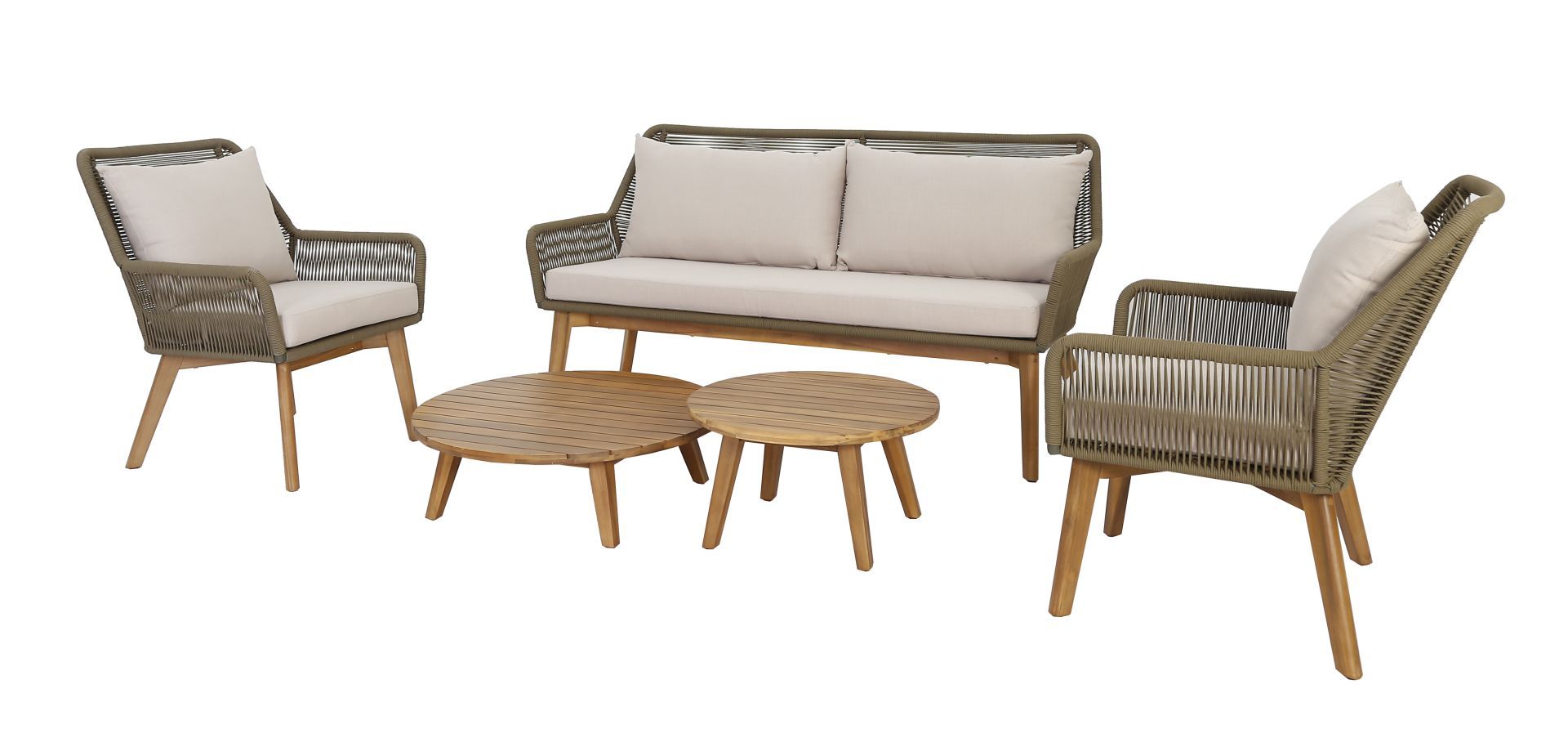 Ένα lounge set 5-τεμαχίων, αποτελούμενο από: 2 πολυθρόνες lounge διαστάσεων 70x81,5x87cm, 1 καναπέ lounge 2-θέσιο διαστάσεων 170x81,5x87cm, 1 κεντρικό τραπεζάκι καφέ διαστάσεων ø80x25cm και ακόμη 1 κεντρικό τραπεζάκι καφέ διαστάσεων ø60x33cm. Ο σκελετός είναι κατασκευασμένος από μασίφ ξύλο ακακίας FSC σε απόχρωση ξύλου teak και χάλυβα πλεγμένος με στρογγυλό σχοινί σε λαδί χρώμα. Natural taupe μαξιλάρια με outdoor ύφασμα. Τα διακοσμητικά μαξιλάρια δεν συμπεριλαμβάνονται.