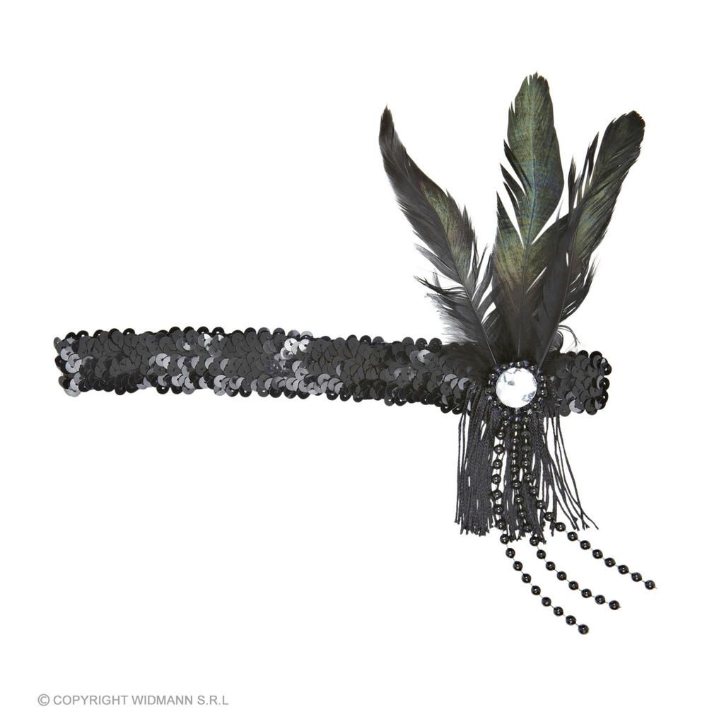 BLACK SEQUIN HEADBAND WITH FEATHER & PEARLS