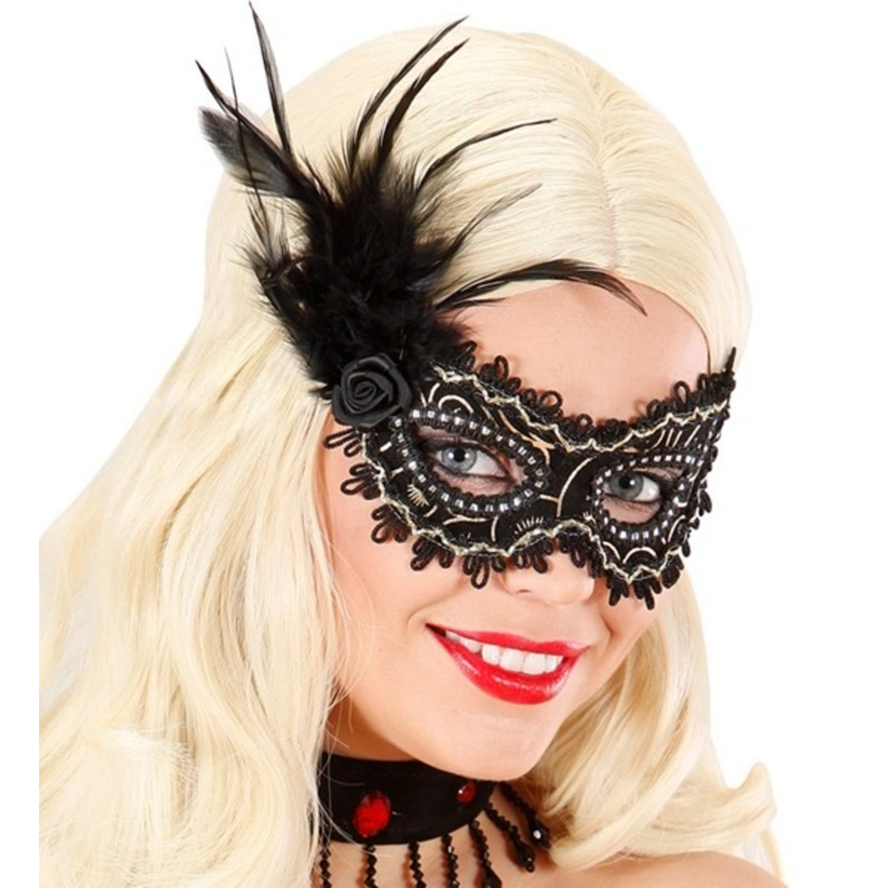 BLACK EYEMASKS WITH ROSE, FEATHERS & GOLD ACCENTS