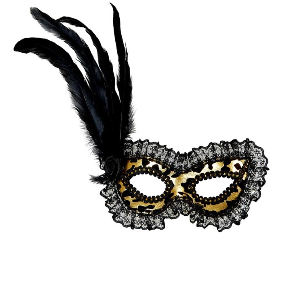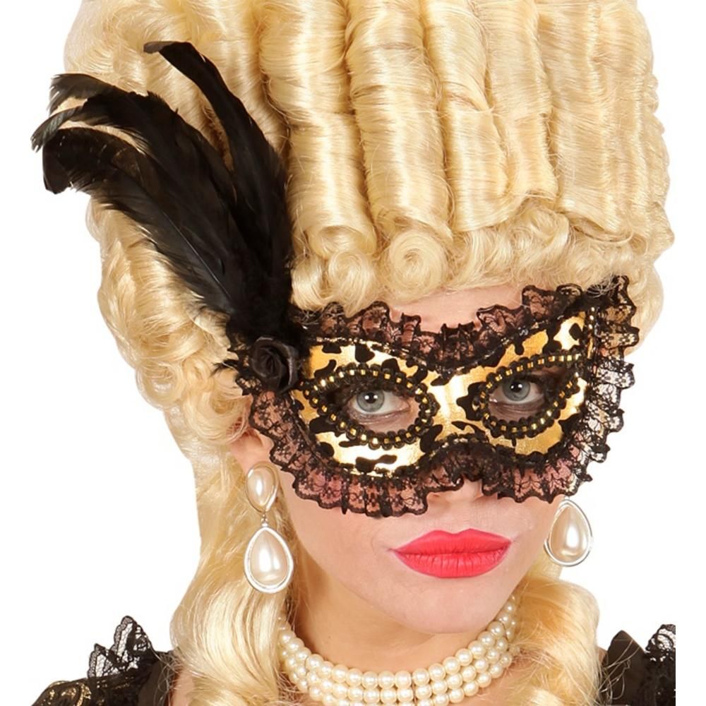 FLOCKED GOLD EYEMASK WITH LACE TRIM, ROSE & FEATHERS